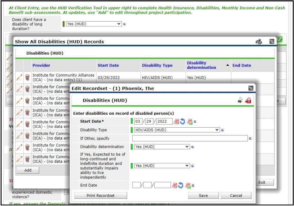 In this example, we’re looking at the Disability sub-assessment. One type of error that takes place during data entry is when the initial prompt response does not match the follow up prompts.