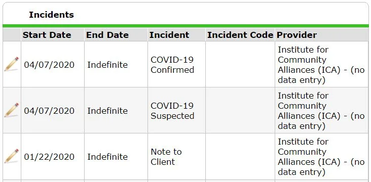 Early in the COVID-19 pandemic, HMIS system-wide visibility was expanded to allow for viewing of clients' Incidents history for the purpose of supporting agencies in COVID response and mitigation. This change applied to only certain project types. Adding the Incidents field to system-wide visibility meant that incidents beyond COVID exposure would also be shared. The statewide HMIS community agreed that while this meant potentially sharing more sensitive information (one example is being banned from a shelter), that the benefits of being able to share time-sensitive COVID information greatly outweighed any risks. But the time has come to sunset this feature.