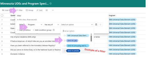 The Data Element List is a library of Minnesota’s Universal Data Elements (required by all projects in Minnesota) and Minnesota’s Program-Specific Data Elements (elements created and required by your State program partner). The list contains: Question Text or Name, Universal Data Element or State Program, Rationale, and other contextual information to assist you in providing feedback for the FY 2027 MN HMIS Data Standards Feedback Survey. Be sure to hover over the (i) of each column name for a description of what each column pertains to. of what each column pertains to.